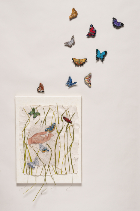 Pearlized acrylic paint on paper glued on Musou Black painted canvas with swarovski crystals